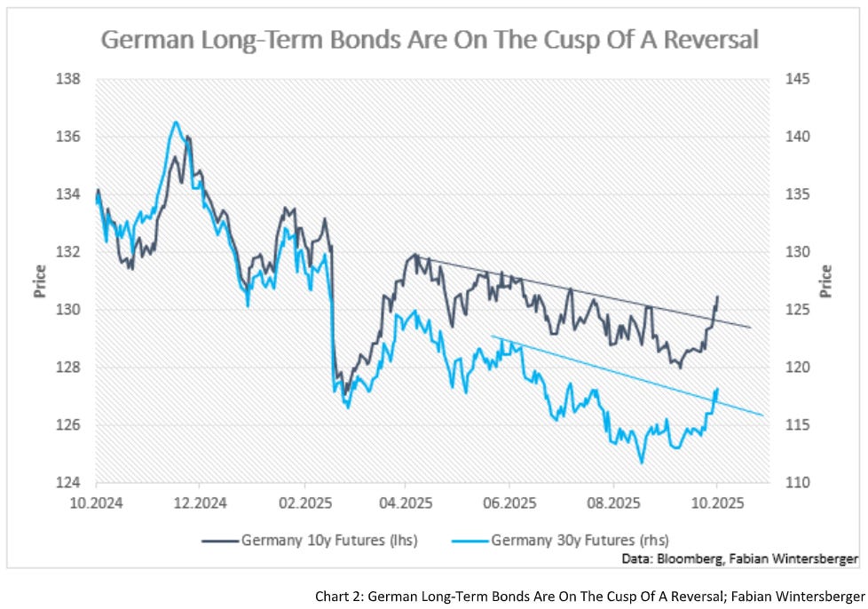 Regarding the bond market, I think that the time has come for a reversal. In the bond market, I sense a reversal brewing. While I’m uncertain about U.S. Treasuries, Europe’s slowdown, grim news, and the ECB’s signal that rates may hold steady for 2025 lead me to believe German government bonds could rally. The 10-year Bund Futures have broken their downtrend, and 30-year Buxl Futures are nearing a breakout. Fundamentally and technically, this view holds water.