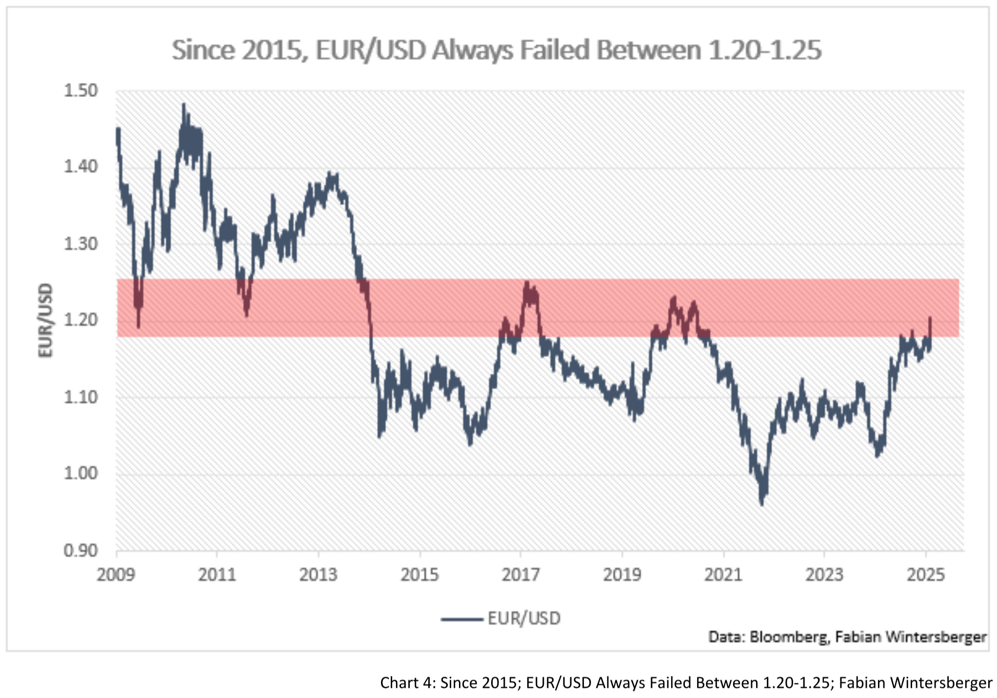 Sentiment is heavily bearish on the dollar at the moment, and if one also considers the broad discussion of the “debasement trade,” then it could indicate that the dollar decline is nearing its end. That doesn’t mean that it won’t fall further, but at least in EUR/USD, the chart picture suggests that 1.20-1.25 is a broad resistance area where the dollar weakness always turned into future dollar strengthened since 2015.