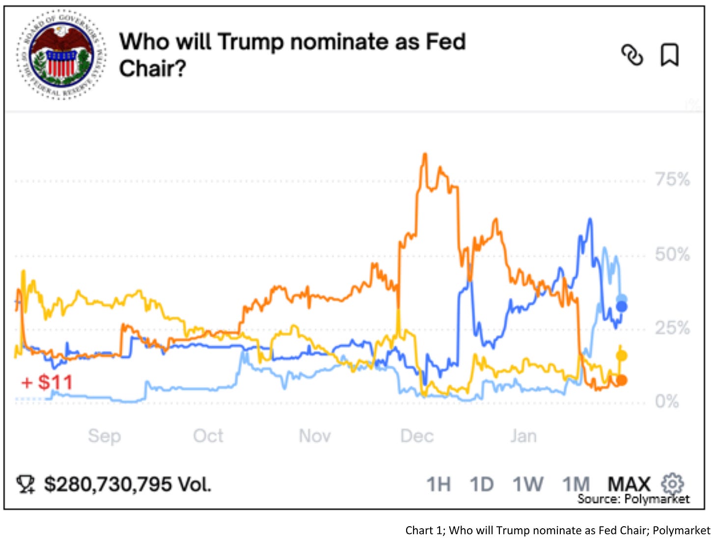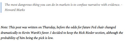 In practical terms, this would imply a bias toward easier financial conditions—supportive of asset prices and favorable to government financing—even as inflation remains above target. Whether Rieder ultimately prevails remains uncertain, particularly as betting odds have recently narrowed again. But his rise underscores a broader shift: markets increasingly expect a Fed leadership more tolerant of running the economy hot, more attentive to financial conditions, and less inclined to lean aggressively against inflation with rate hikes alone.