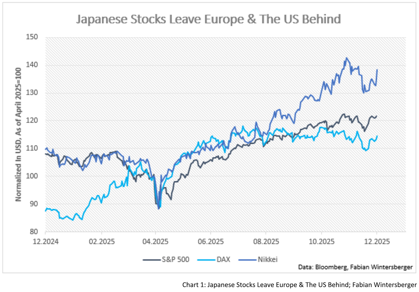 But while European stocks are falling behind, another part of the world has outperformed the US, namely, emerging markets. Japanese stocks are exploding on the upside, and the divergence has widened further since Takaichi Sanae won the election in October, also adjusted in USD terms.